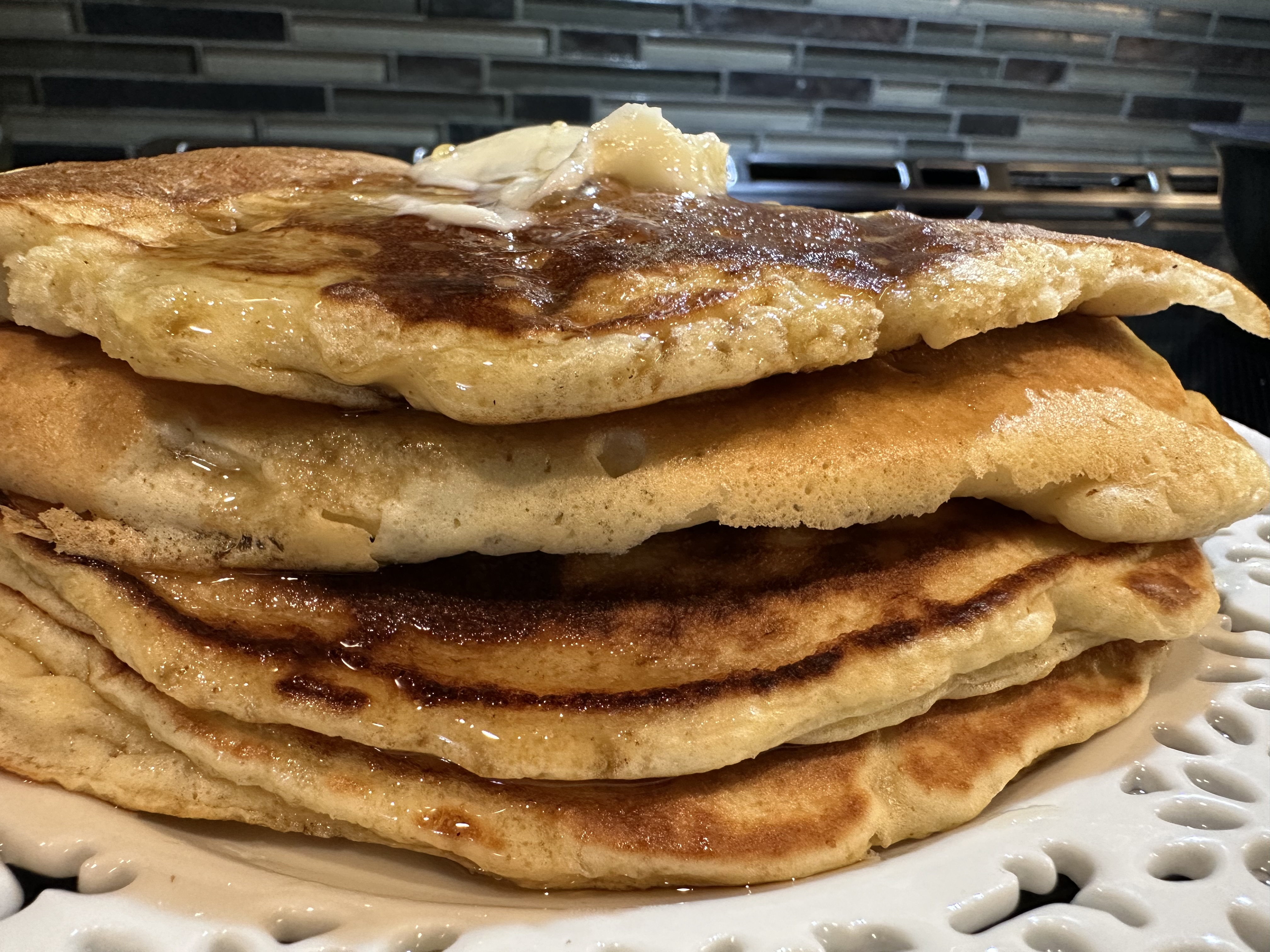 Stack the pancakes on a warm plate and serve with butter, syrup, fruit, or your favorite toppings.