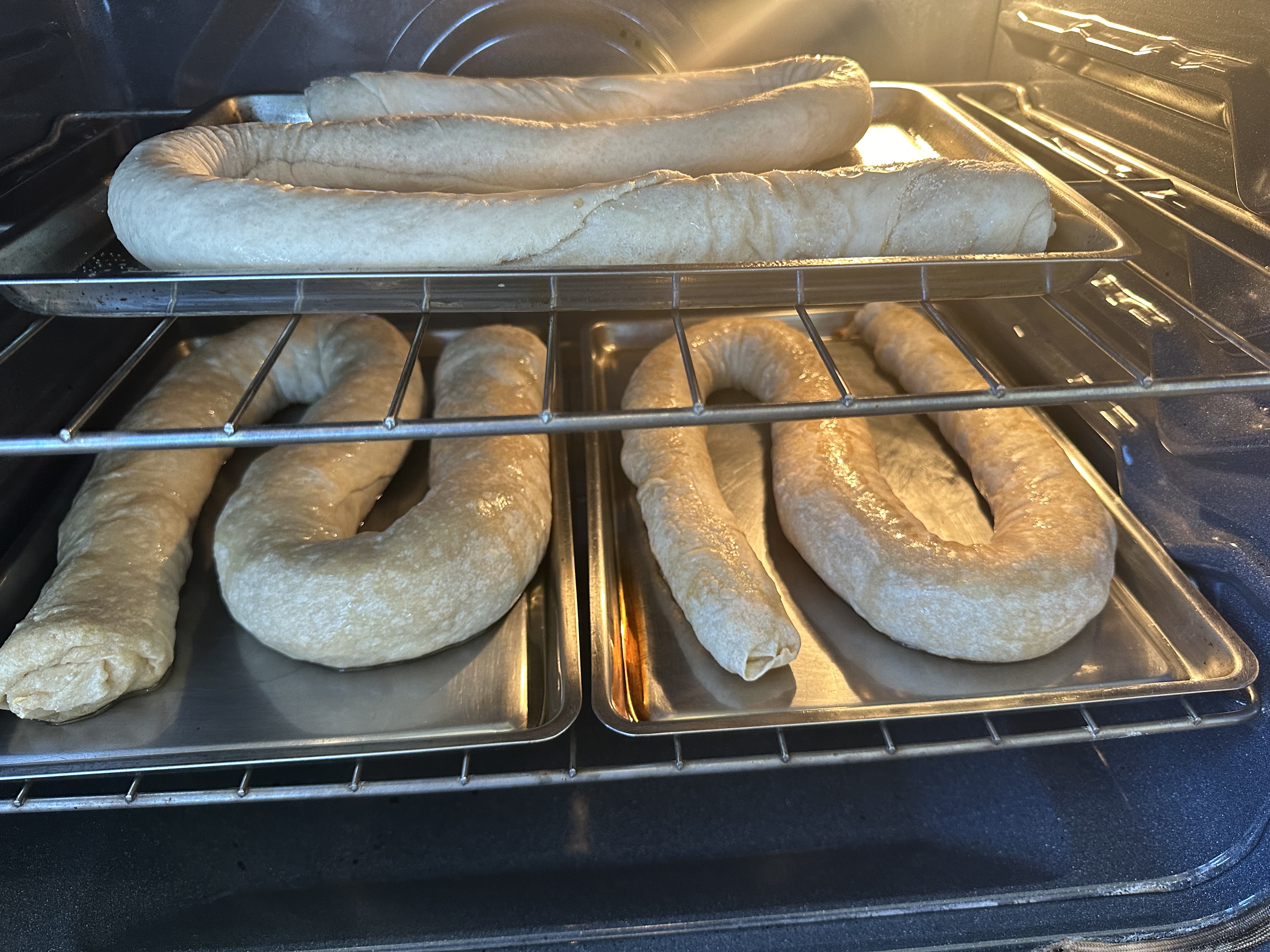 Grease a cookie sheet lightly with oil. Place the strudel seam-side down and brush the top with more oil for a golden finish.