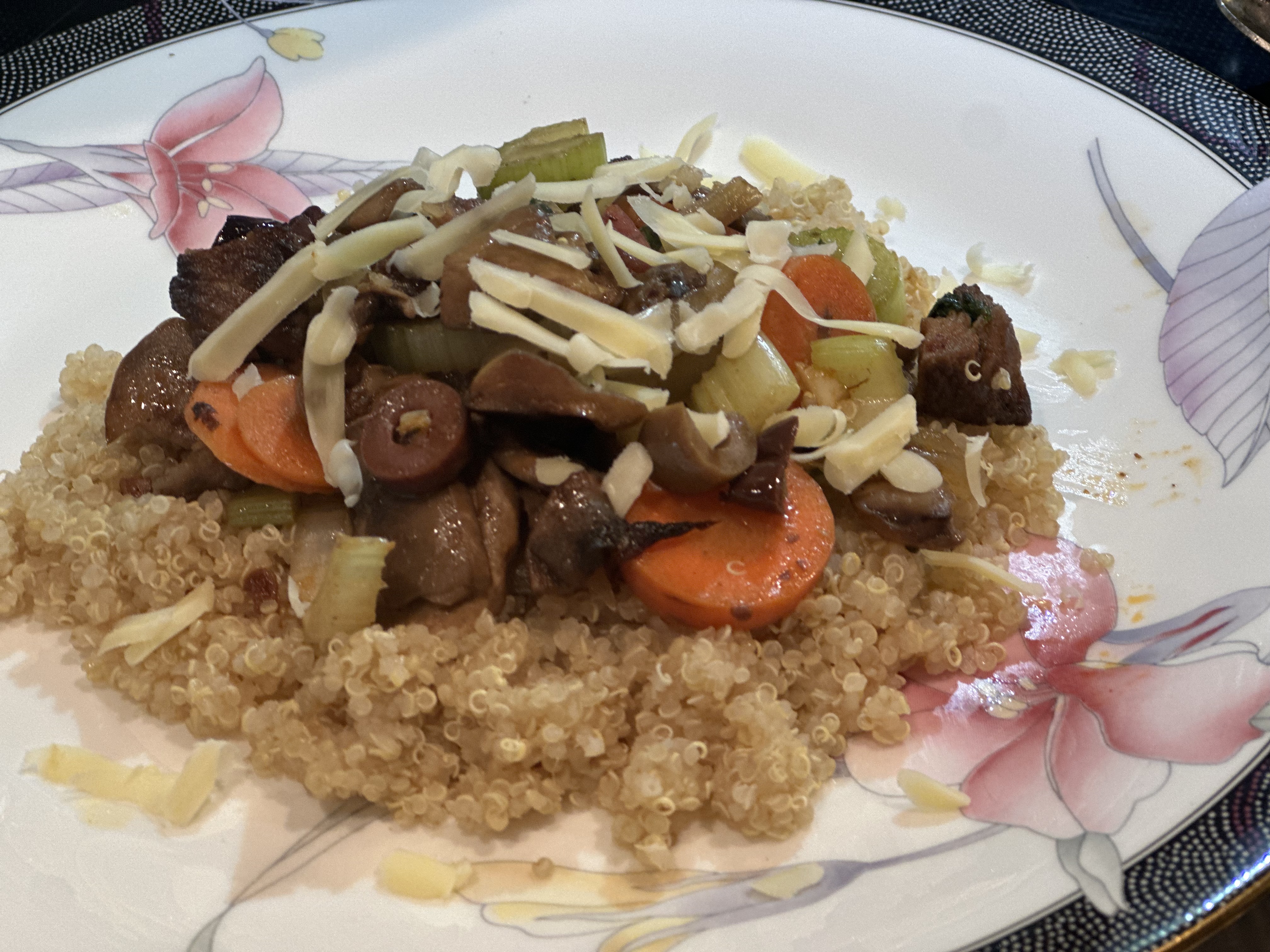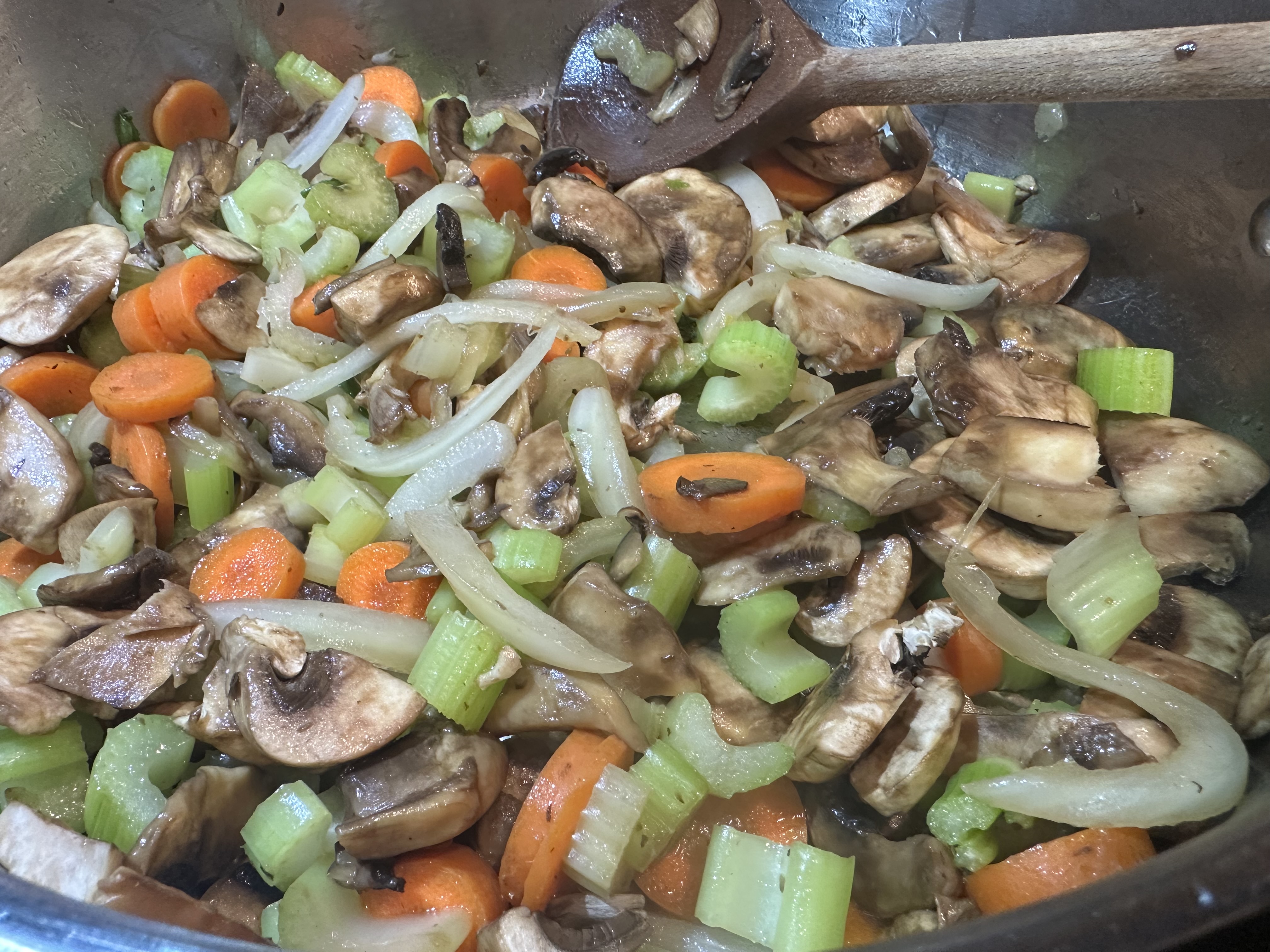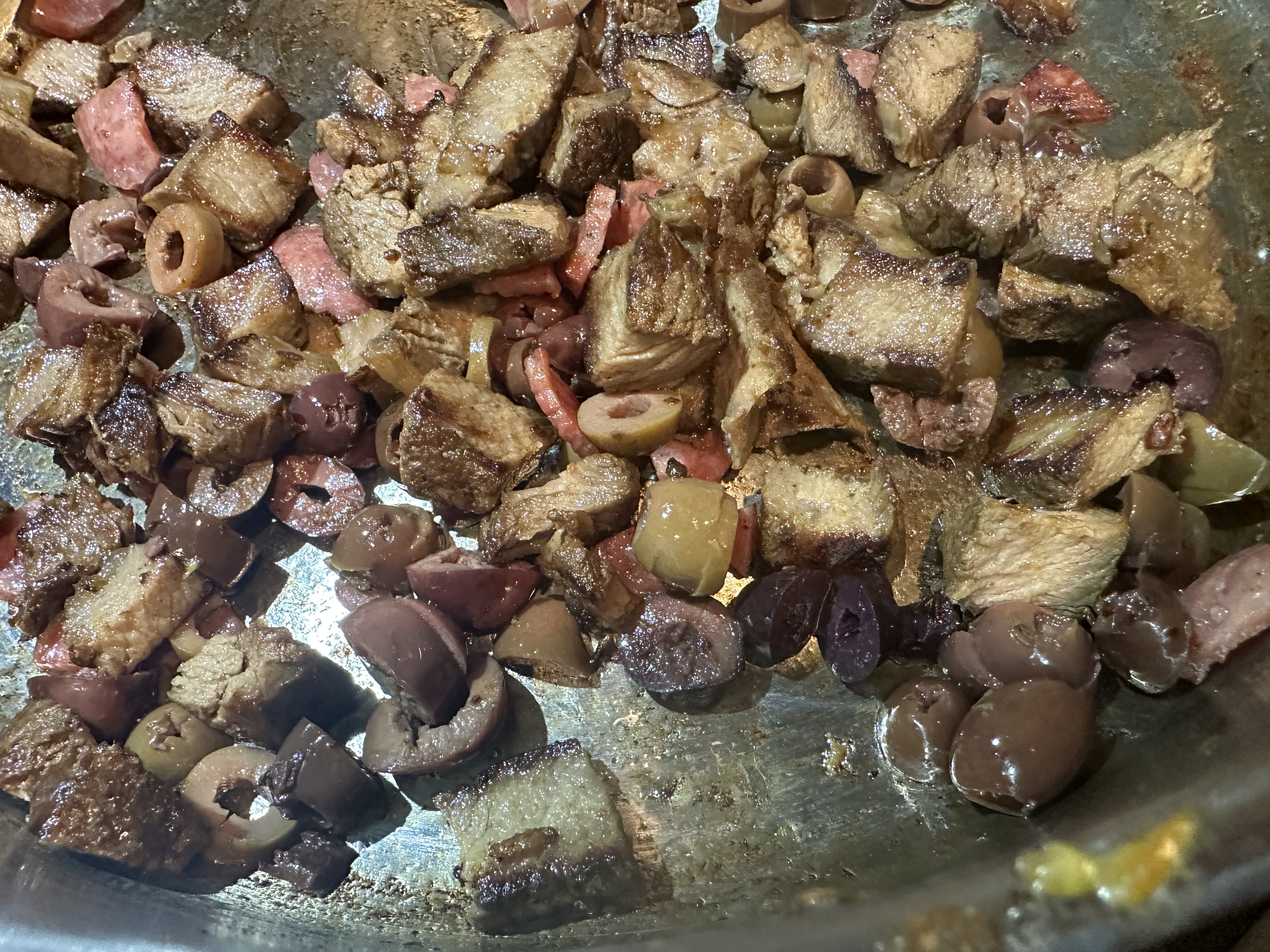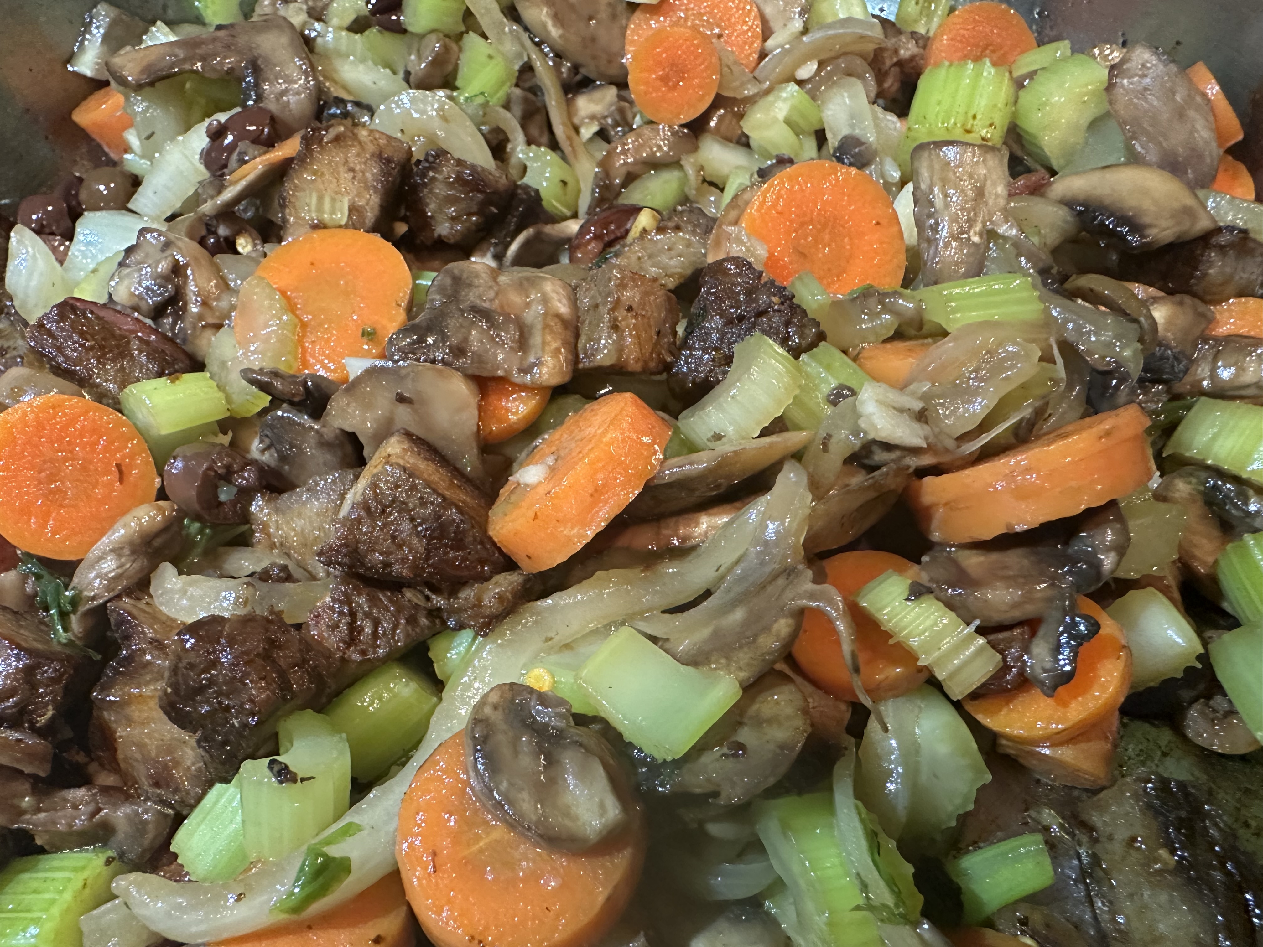 Step 2. Heat olive oil in a large skillet. Sauté onions, carrots, celery, and mushrooms until softened and lightly golden, then add garlic for 1 minute. Push to the side, brown sausage slices, then add steak strips and warm through.