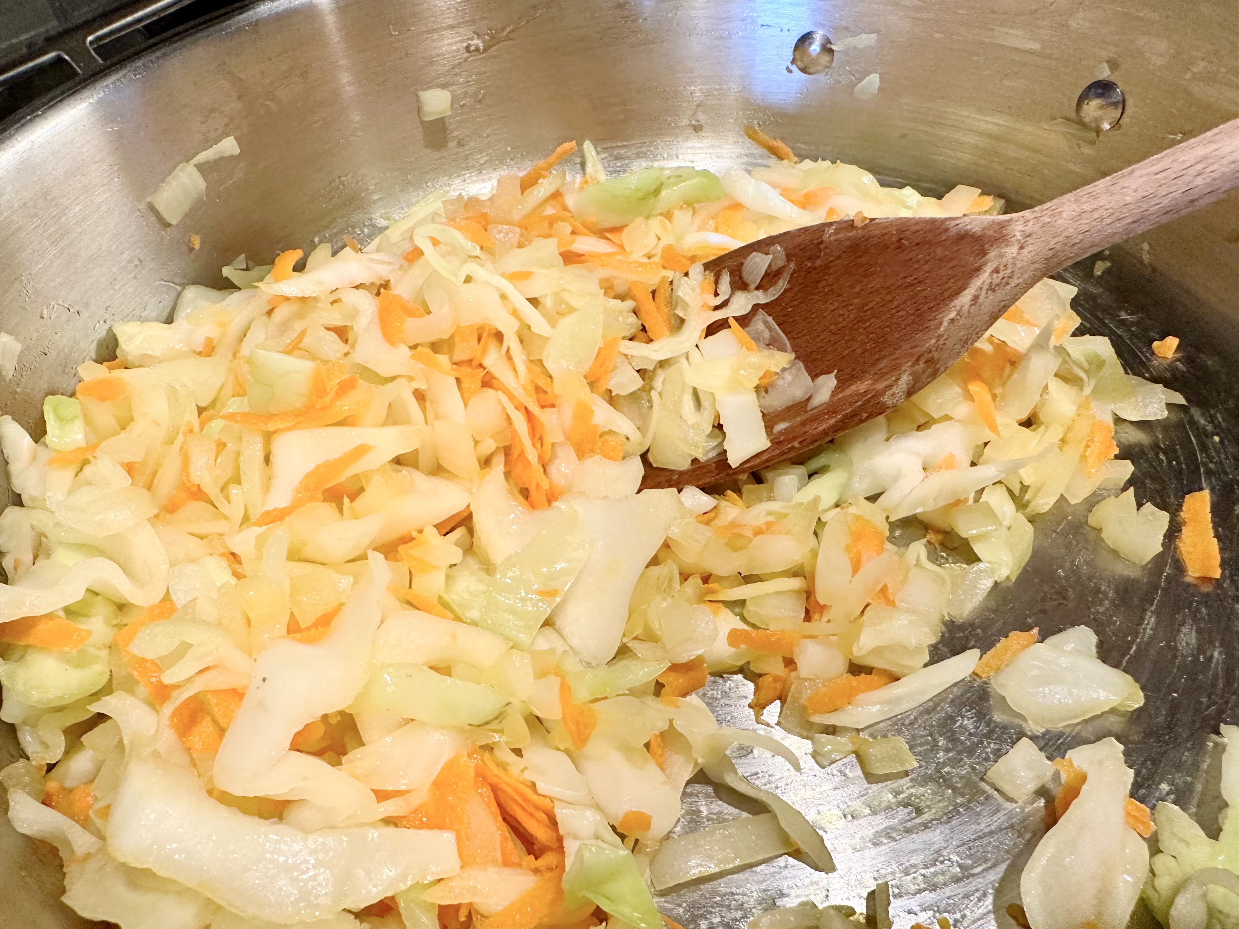 In a frying pan or wok, heat 1–2 tablespoons of vegetable oil over medium heat. Add the chopped onion and cabbage. Sauté until the onion softens and the cabbage starts to turn golden, about 4–5 minutes.